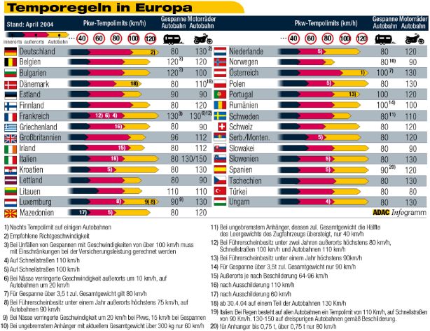 Tempovielfalt auf Europas Straßen (Quelle:ADAC)(hr) (adac) Wer seine Urlaubskasse nicht auch noch mit Bußgeldern belasten will, sollte sich penibel an die unterschiedlichen Temporegeln in Europa halten. So darf zum Beispiel in Norwegen nur 90 km/h auf Autobahnen gefahren werden. Der ADAC hat die Geschwindigkeitsbestimmungen in Europa zusammengestellt.
