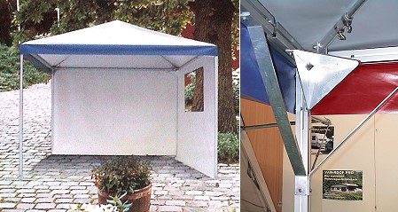 Die Grundfläche des Pavillons beträgt standardmäßig 3 x 3 m, die Seitenwände messen 3 x 2 m. Andere Abmessungen sowie abweichende Dach- und Wandfarben (auch im Streifen-Dessin) sind auf Anfrage möglich. So lässt sich der Pavillon optisch auf Vorzelt oder Vorzeltüberdachung abstimmen.