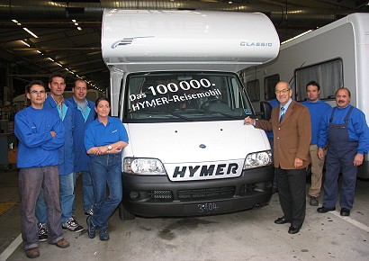 Jubiläumsmobil für karitativen Zweck (Foto:Hymer)(hr) Großes Jubiläum bei Hymer, Europas führendem Hersteller von Reisemobilen. Exakt um 15.30 Uhr verließ am 27. Oktober 2004 das 100.000ste Hymer-Reisemobil, ein Hymercamp-Classic 524, die Produktionshallen in Bad Waldsee.