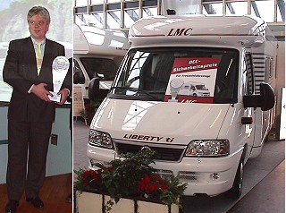 DCC-Sicherheitspreis für teilintegriertes Reisemobil aus dem Münsterland LMC-Geschäftsführer Reiner Ritz mit dem DCC-Sicherheitspreis. Rechts das prämierte Reisemobil am LMC-Stand auf der Messe Stuttgart. (Fotos:Richter)(hr) Das Reisemobil Liberty 6850 ti des Münsterländer Herstellers LMC ist Träger des DCC Sicherheitspreises 2004. Der Preis wurde gestern im Vorfeld der Messe CMT in Stuttgart vom Präsidenten des Deutschen Camping-Clubs (DCC), Dr. Hans-Josef Giesen, an LMC-Geschäftsführer Reiner Ritz übergeben.